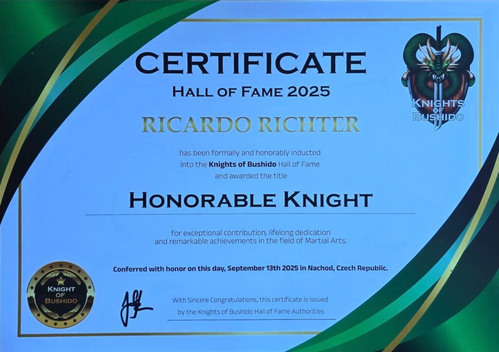 Manche Momente im Leben sind so überwältigend, dass man kaum die richtigen Worte findet. Ich habe einen solchen Moment erlebt, denn ich wurde offiziell am 13.09.2025 in die Knights of Bushido Hall of Fame aufgenommen und mit dem Titel Honorable Knight ausgezeichnet.